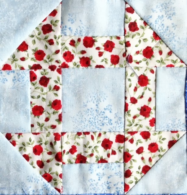 Een van de mooiere blokken, maar niet zo heel mooi op de foto gekomen. Er is een moment gekomen dat ik sneller quilt dan blog, dus deze foto's zijn gemaakt terwijl de blokjes al in de top zitten. Maar omdat ik toch van elk blokje een aparte foto laat zien, heb ik hier ook maar foto's van gemaakt. Ik heb al gemerkt dat mensen mijn blog als naslagwerk gebruiken (van hoe moest dat blokje ook alweer nu ik mijn boek even niet voor handen heb) en dat wil ik dan ook graag volledig houden.